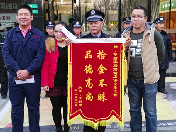 2015年10月23日18是許,保安李明寶在當(dāng)日營(yíng)業(yè)結(jié)束清場(chǎng)檢查時(shí),在張家口華耐高新店商場(chǎng)南區(qū)3層衛(wèi)生間撿到1只皮挎包,立即教到物業(yè)部值班室,經(jīng)值班人員共同檢查,內(nèi)有包括汽車鑰匙、多張信用卡、駕駛證等物品。19時(shí)30分,失主前來尋找。次日上午,為感謝李明寶,失主專程送來“拾金不昧,品德高尚”錦旗一面。
